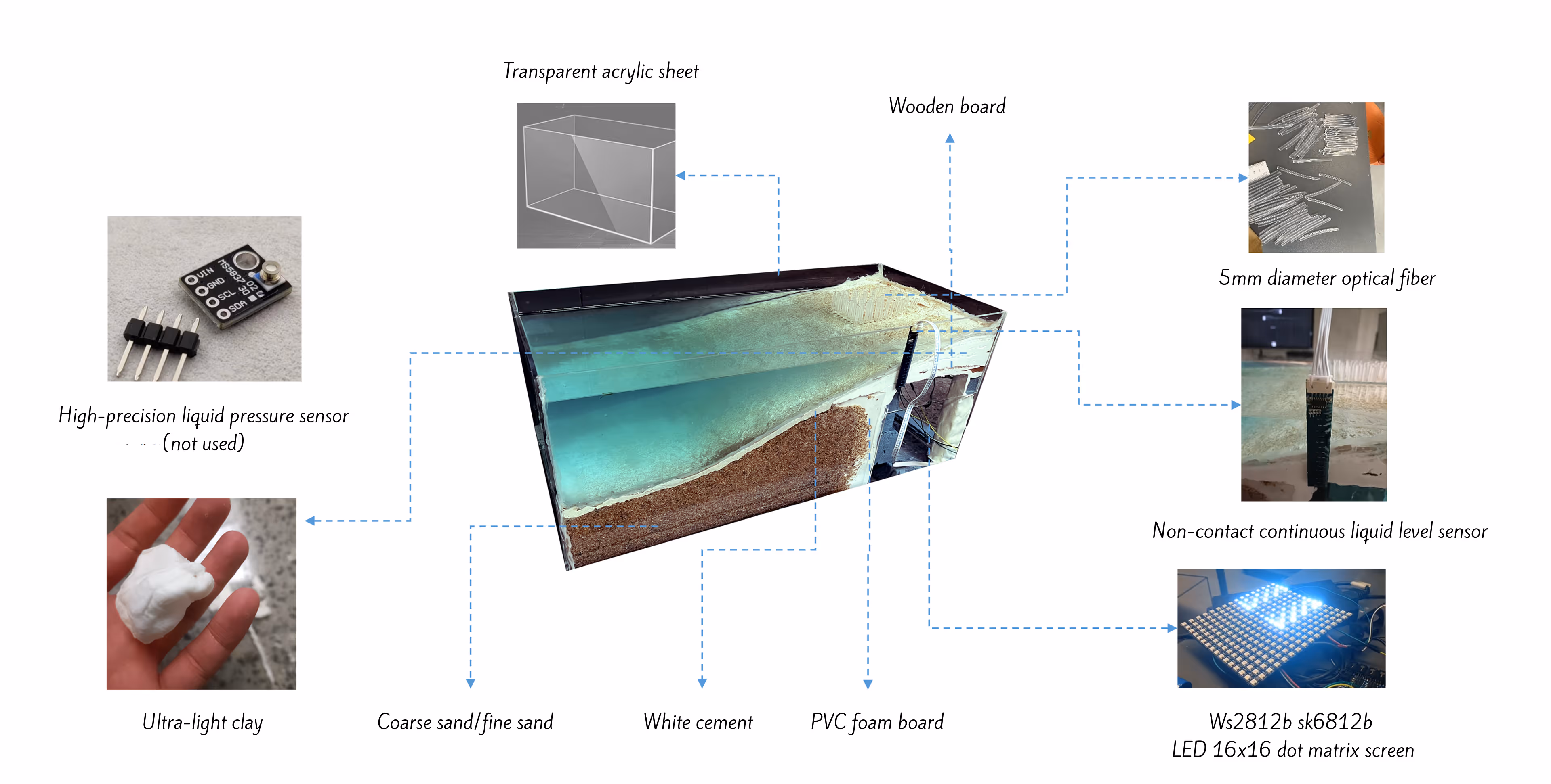 In the prototype, we use a water level detection sensor to monitor the timing of the waves' emergence. When the waves rise, the installation's lights are activated, and the light and shadow change in rhythm with the ebb and flow of the tides.The light columns are simulated using thick optical fibers, with an LED dot matrix hidden directly beneath the optical fiber array. Each LED light corresponds to a single optical fiber light column.
